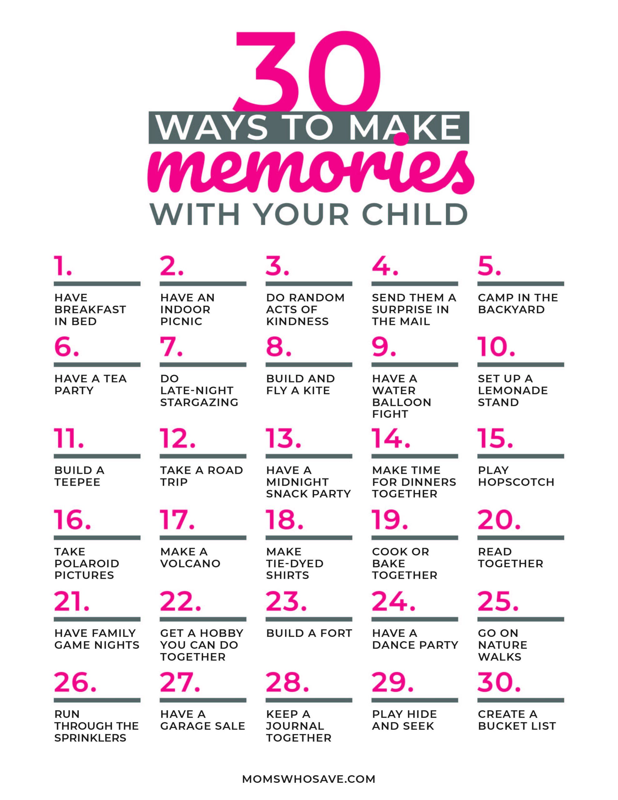 In that spirit, here are 30 easy ways to make lasting memories with your child:
