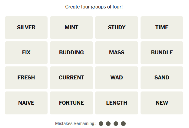 Today’s Connections words are: Silver, Mint, Study, Time, Fix, Budding, Mass, Bundle, Fresh, Current, Wad, Sand, Naive, Fortune, Length, New