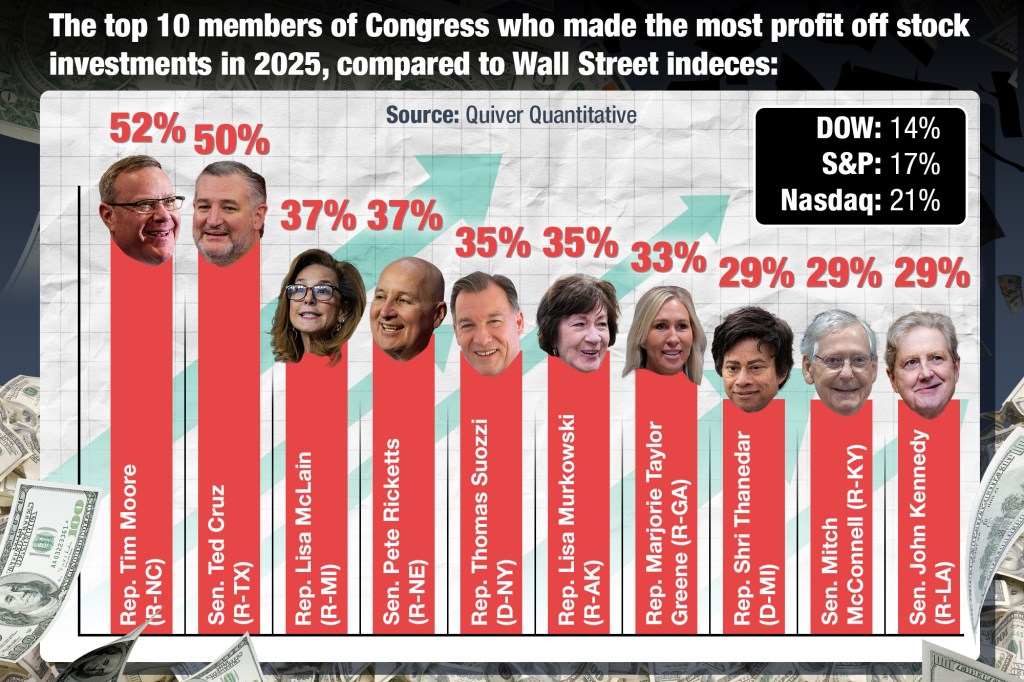 Suozzi’s 35% gain significantly exceeded the performance of major indices, such as the Dow’s 14% increase, the S&P 500’s 17% rise, and the Nasdaq’s 21% growth, as per exclusive information shared with The Post by Quiver Quantitative, a firm that monitors stock transactions of members of Congress.