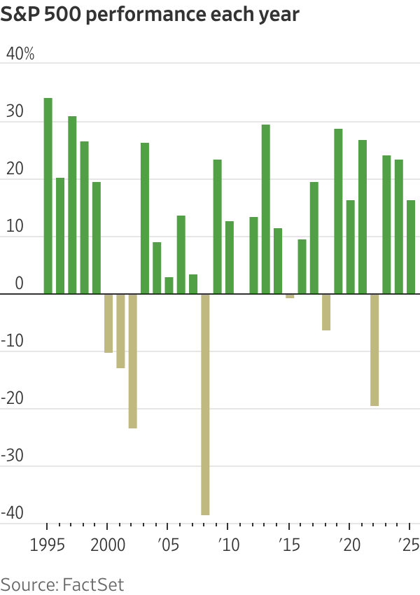 The ongoing rally is becoming lengthy, especially when measured against previous market cycles. If the S&P 500 increases in 2026 for the fourth year in a row, it would mark the longest such period since 2007, when the benchmark achieved a five-year consecutive gain. Throughout the index’s history, there have only been five instances of four or more years in a row of gains, as reported by Dow Jones Market Data.